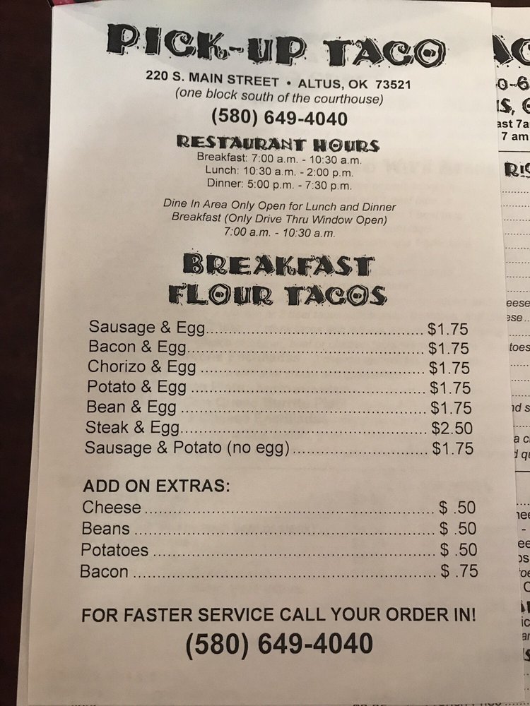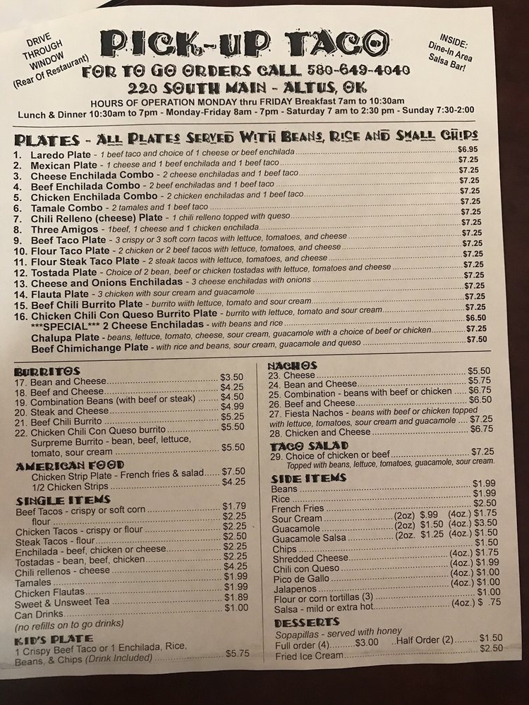 Pickup Taco, located in Altus, OK, is a Mexican restaurant known for its convenient takeout service and delicious menu offerings. Customers rave about the chicken enchiladas, breakfast tacos, and savory steak tacos. The salsa has been applauded as the best ever tasted, adding an extra kick to every meal. The tamale smothered in chili and the beans have also received high praise. Although some dishes may have slight drawbacks, the overall dining experience is extremely enjoyable. Pickup Taco's cozy, divey atmosphere adds to its charm, making it a favorite among locals. With its reasonable prices and friendly staff, this hidden gem stands out as a must-visit for Mexican food enthusiasts.